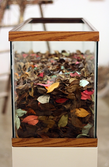 Aquarium, Camellia leaves, house paint; 36.25” x 12.5” x 18”